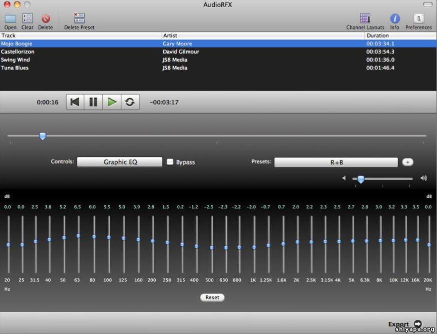AudioRFX - сильное аудио, обрабатывающее применение, предлагающее много аудио фильтров, эффектов и аудио особенностей повышения. Используйте графический уравнитель с 31 группой, чтобы получить точное качество звука, которое Вы хотите для аудио файла, затем экспортируете его в новый файл. Или используйте любые из аудио средств управления за эффектом, чтобы применить эффекты, такие как искажение, задержка, реверберация, и т.д. AudioRFX использует сильную Основную технологию Мультипликации, чтобы позволить всем средствам управления для многих эффектов и фильтров эффективно рассматриваться. AudioRFX доступен теперь в App Store Mac для Операционной системы Mac OS X 10.6 и 10.7.