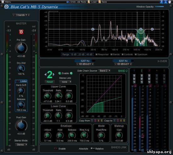 Blue Cat's MB-5 Dynamix is an extremely powerful all-in-one multiband dynamics processor: it can be used as a multiband compressor, limiter, gate, expander, waveshaper or all combined at once, on any part of the spectrum. The unique dynamics processing section of the Blue Cat's Dynamics plug-in has been streamlined and integrated in this plug-in to process each one of the 5 bands separately.