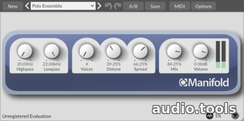 Manifold is a harmonizer audio effect that works by splitting an input signal into as many as 20 individual voices, each of which are detuned and scattered around the stereo panorama. Manifold is capable of producing a wide range of effects; from subtle modulations that add interest to lifeless sounds, to extreme detuning that fattens the weakest of input sources.