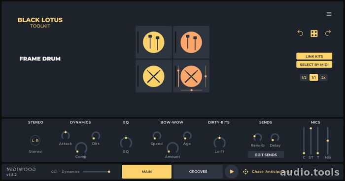 Dundun, Frame Drum and Sticks all come with a handcrafted selection of midi grooves to get you composing straight away. All grooves come with an inherent preset that you can load at the same time using the Load With Sound Preset button. You can also choose to keep your preset and only load the grooves.