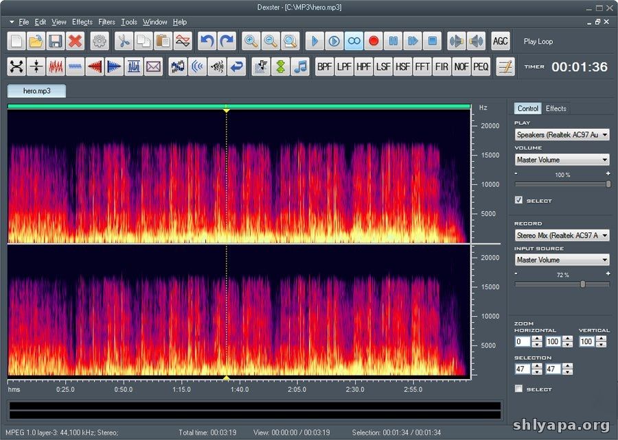 Apply Audio Filters and Audio Restoration Apply audio filters to the selected part of an audio file; Band Pass Filter, FFT Filter, High Pass Filter, High Shelf Filter, Low Pass Filter, Low Shelf Filter, Notch Filter, Peak EQ Filter, FIR Filter Vocals, Noise, Clicks, Pops, Reduction