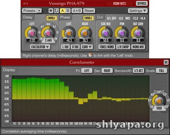 Beside the phase shifting, PHA-979 features positive and negative time delaying that eliminates the need to move in-track events in the sequencer when doing time alignment over any set of recorded tracks. PHA-979 also provides mid/side channel balance and panning controls that permit you to record stereo microphone pairs into a single stereo track without resorting to dual mono recording (on separate tracks) which usually becomes time-consuming in a further editing.