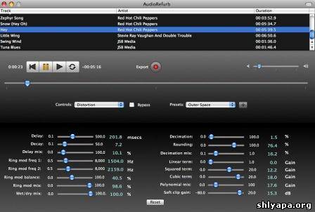 AudioRefurb - сильное, но недорогое новое применение обработки аудио, которое Вы можете использовать во многих различных ситуациях. Используйте графический уравнитель с 31 группой, чтобы получить точное качество звука, которое Вы хотите для аудио файла, затем экспортируете его в новый файл; теперь улучшенный звуковой файл может быть скопирован на Ваш iPod, более бездельничание с контролем над Вашим iPod, чтобы получить правильный звук. Или используйте любые из аудио средств управления за эффектом AudioRefurb, чтобы применить эффекты, такие как искажение, задержка, реверберация, и т.д. AudioRefurb использует сильную Основную технологию Мультипликации, чтобы позволить всем средствам управления для многих аудио эффектов эффективно рассматриваться.