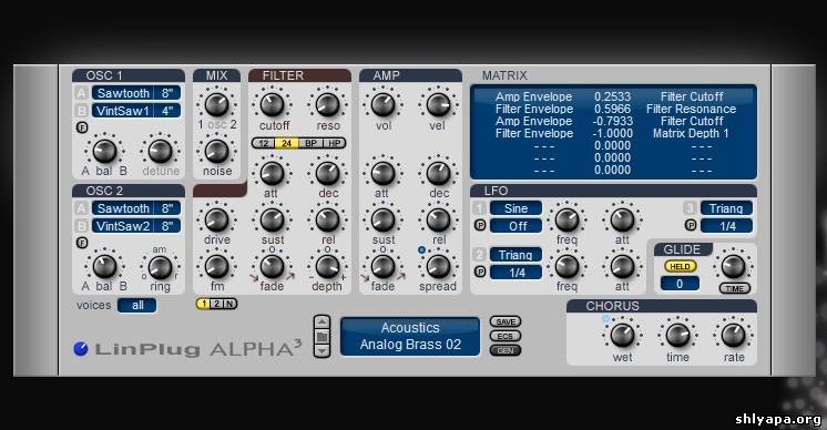 VST plug-in instrument for PC 2 Oscillators with numerous waveforms PWM (symmetry of all waveforms modulatable) Switchable freerun for both oscillators Extended Ringmodulation (modulatable Off-AM-RM) Noise Oscillator Spread (5 detuned oscillators per voice, adjustable) Rich sounding multimode filter with saturation dedicated filter ADSFR envelope Amplifier section with dedicated ADSFR envelope 7 slot Modulation Matrix, 19 sources, 18 destinations