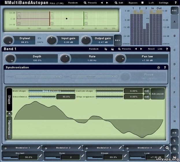 Smart randomization - using a single button you can generate completely new settings. By clicking the button you can walk through the billions of possible settings and find the best one for you! The smart randomization algorithm wisely chooses between which parameters can be randomized and how. It can even randomize modulators for you. And if that's too much, you can just hold ctrl and MMultiBandAutopan will only slightly modify existing settings.