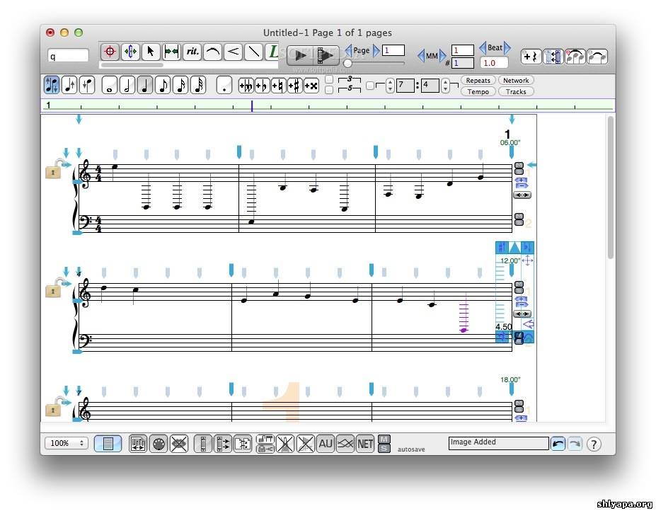 Complete set of standard music symbols (from double whole to = 128th notes and rests) Supports all accidentals (including quarter sharps and flats - which can be set to playback through MIDI) Simple graphics (rectangles, circles, lines in grayscale, filled or framed) Any image can be any size and any colour Unlimited number of voices per staff (default set at 3) Unlimited number of notes per chord Permits extreme rhythmic complexity Flexible beaming of notes (e.g. across staves and barlines) Correct placement of notes in chord clusters Correct placement of accidentals in chords Correct vertical alignment of all music images Correct beaming of notes (beam angle and vertical position) Correct system formatting according to a complex spacing algorithm Automatic tieing of notes which exceed the measure duration User can adjust the positions of accidentals, noteheads, stems, etc.