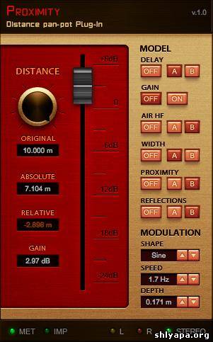 This plug-in is an easy to use distance "pan-pot" based on several psycho-acoustic models. The idea is to give mixing engineer a reliable tool which allows him to manipulate the "depth" of several sound sources in a straight forward and convincing manner.