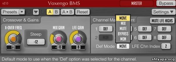 The main purpose of BMS is to simplify evaluation of low-frequency content present in non-LFE channels during mastering. At the same time, it is possible to mix extracted low-frequency content to the LFE ("Low Frequency Effects”) channel. An option to remove the extracted signal from non-LFE channels is also available.