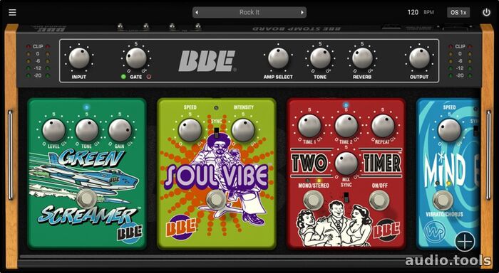 Stomp Board is a standalone application and plug-in set containing the host "Stomp Board" with an integrated amp simulator, and 8 premium modelled effect plug-ins from the original BBE Stomp Ware classics.