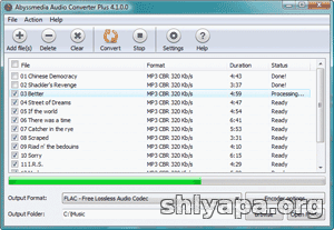 Abyssmedia Audio Converter Plus is a powerful, professional solution designed for converting the most popular audio formats and Audio CD tracks directly into MP3, WMA, OGG, AMR, FLAC, APE or WAV formats. High-quality 32-bit converter engine guarantee performance boost on multi-core CPU and allows precision sample rate conversion. Converter can process 24-bit and 32-bit WAV files for DVD Audio mastering. Integration with Windows Explorer enables easy conversion for entrie folders. Just add audio files, select output folder and format and you are ready to convert them in one click.