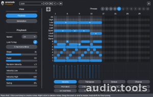 If you want quick access to an unlimited number of phrases, you can use the built-in generation tools to quickly get inspiration. Simply set how you want the notes and controller data to be generated, and Phrasebox will create a unique phrase pattern with just the click of a button.